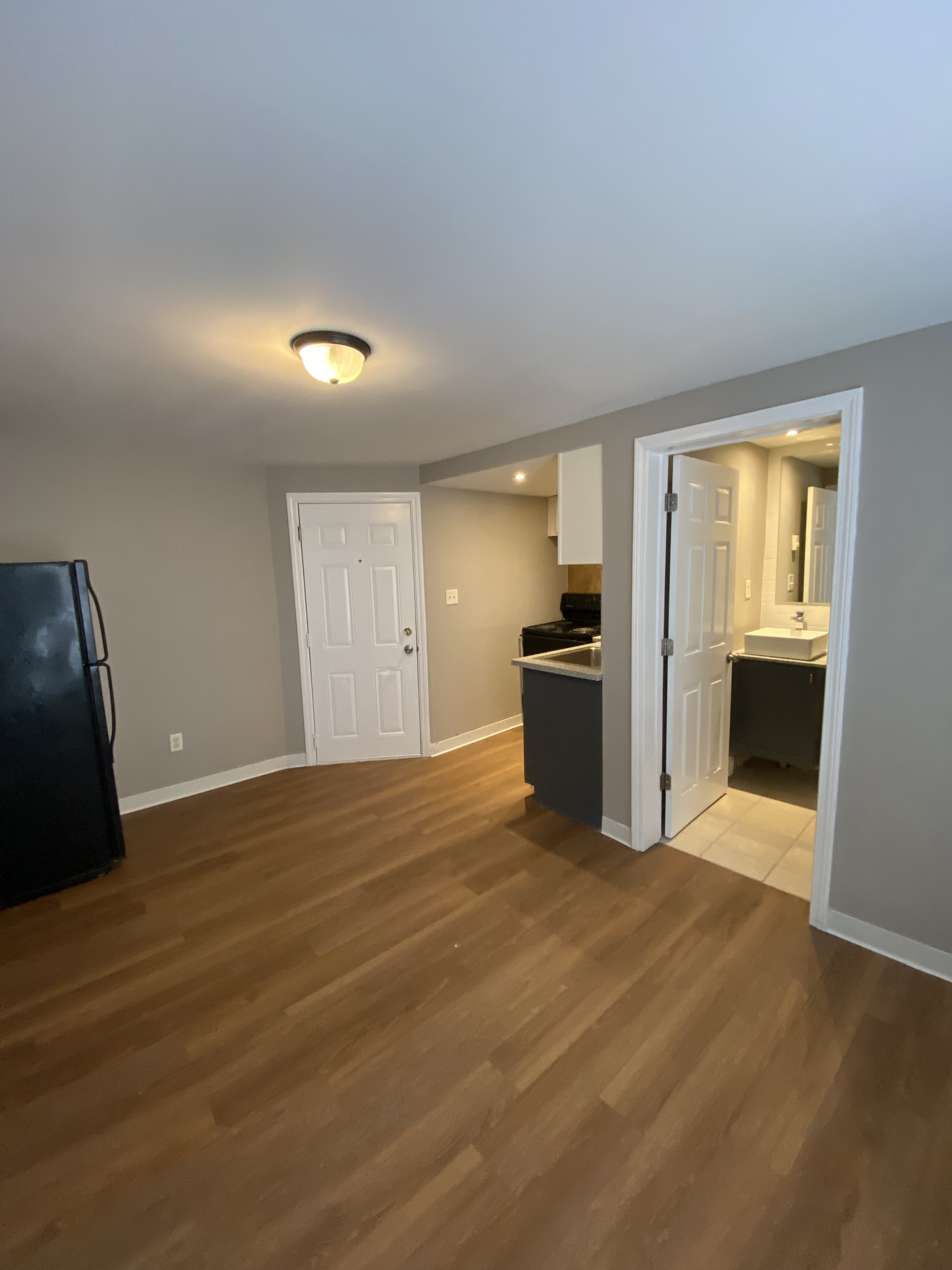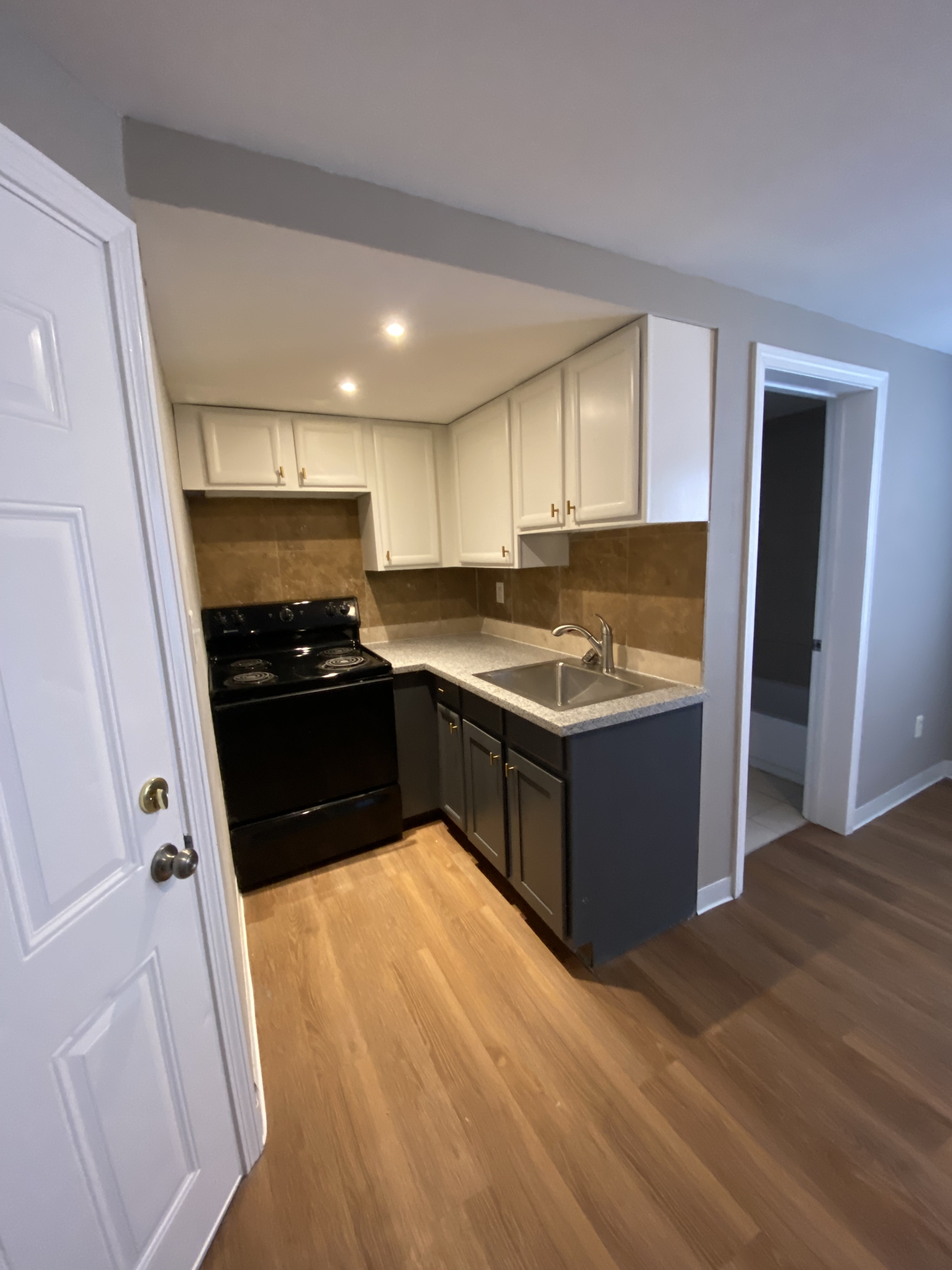 Updated small one bedroom unit. Bathroom has tile floor and bath enclosure. kitchen/living area has wood laminated floor and recessed lights in the ceiling. The bedroom has carpeting. Recently upgraded small one bedroom unit located on the first floor granite countertops can lights and upgraded plumbing fixtures tiled bathroom Luxury vinyl plank flooring